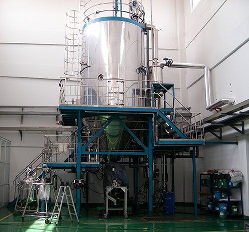 压力喷雾干燥机组工作原理:主要由液体切线入口、液体旋转室、喷嘴孔等组成,利用高压泵使液体获得很高的压力(2~20MPa),从切线入口进入雾化器的旋转室中,液体在旋转室获得旋转运动。结果在雾化器中央形成一般压力等于大气压的空气旋流,而液体则形成绕空气心旋转的环形薄膜,液体静压能在喷嘴处转变为向前运动的液膜的动能,从喷嘴喷出。液膜伸长变薄,后分裂为小雾滴。